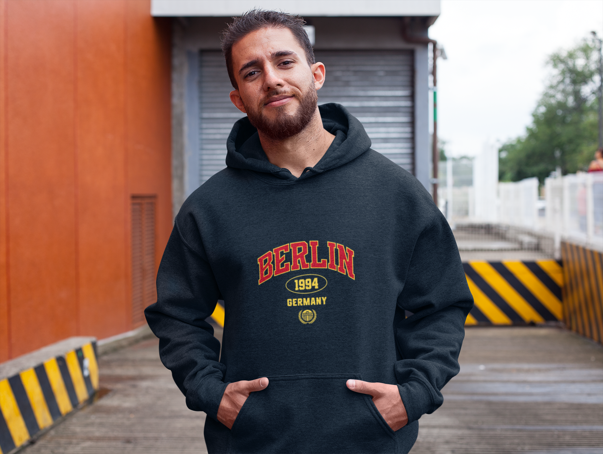 Show off your streetwear edge with the Berlin 1994 Germany Hoodie in classic navy. Featuring bold varsity-style lettering in red and gold, this hoodie brings a retro yet modern vibe to your everyday look. Made with a soft cotton-blend fabric, it offers all-day comfort, warmth, and durability.